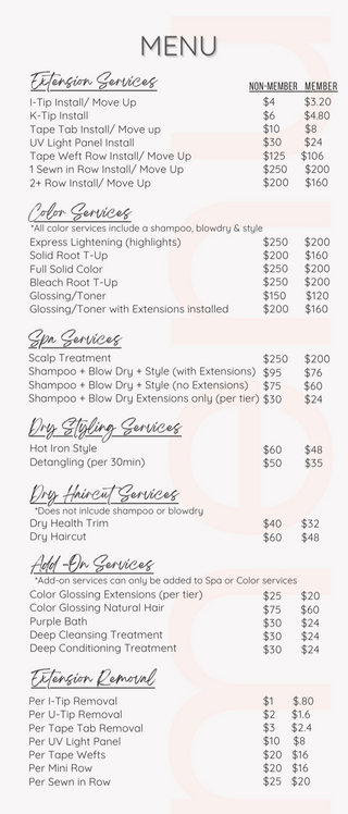 All services are listed below, for menu questions please contact us at 619-416-8641.